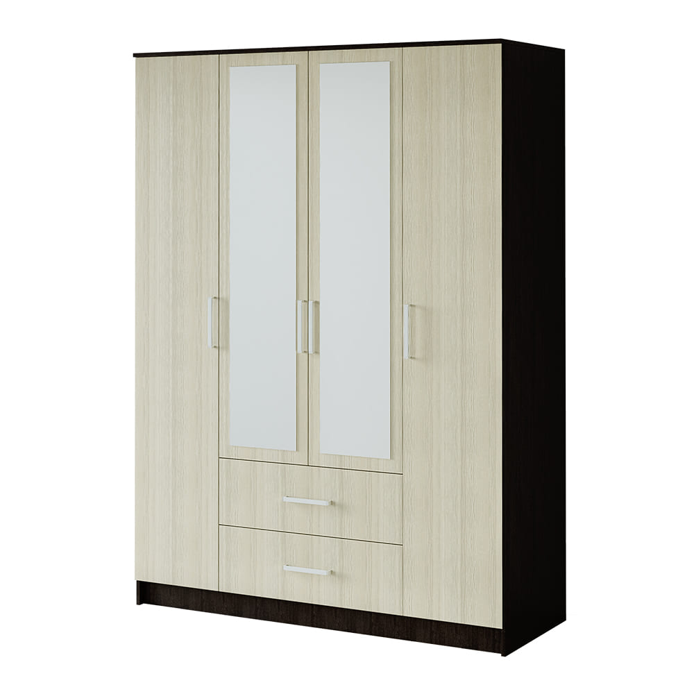 Вместительный четырёхстворчатый шкаф Фиеста справится с большим гардеробом и другими вещами. Модель выполнена из качественной ЛДСП. Корпус сделан в темном цвете венге, а фасады – в светлом лоредо. Комплектация представляет собой центральную зону с двумя нижними выкатными ящиками и отделения со штангой для одежды на плечиках. Справа и слева расположились многочисленные полки для вещей. В створки центральных дверок вмонтированы зеркала. Правильный выбор по лучшей цене — это шкаф четырёхстворчатый Фиеста венге в компании «Семья Мебелони».