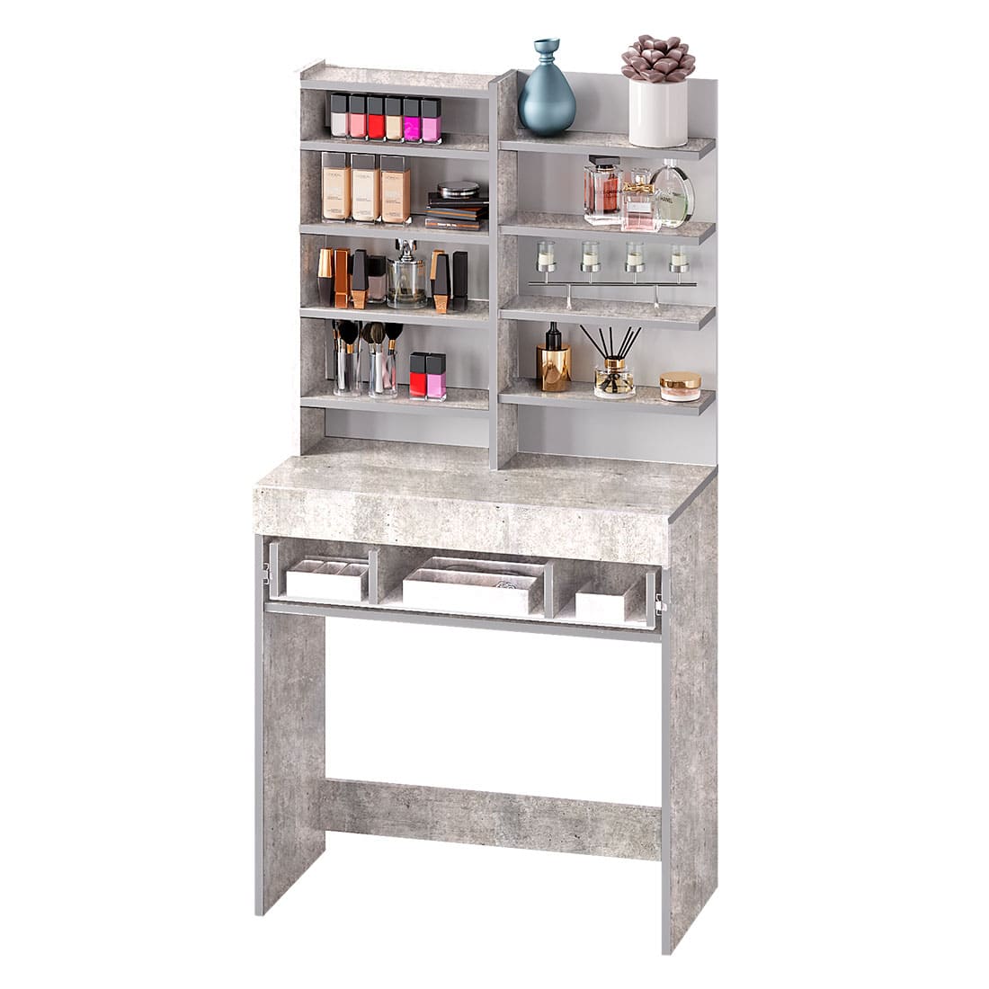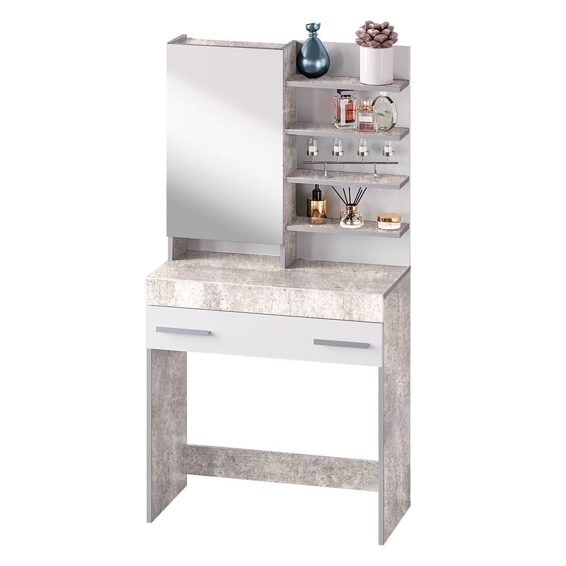 Косметический стол из мебельной коллекции Инстайл – незаменимый атрибут для любой женщины! Разместить все необходимые бьюти-гаджеты, средства для ухода за лицом и волосами можно в данной модели. В столешницу встроен выдвижной ящик с отделениями для хранения различных мелочей или украшений. Туалетный стоик обладает большим количеством полок, часть из которых спрятаны за зеркальной дверцей, а часть является открытыми, чтобы предметы первой необходимости всегда были под рукой! Гармоничное сочетание белого и серого цвета позволит косметическому столу украсить любой интерьер. Лучший выбор — это косметический стол Инстайл в компании «Семья Мебелони».