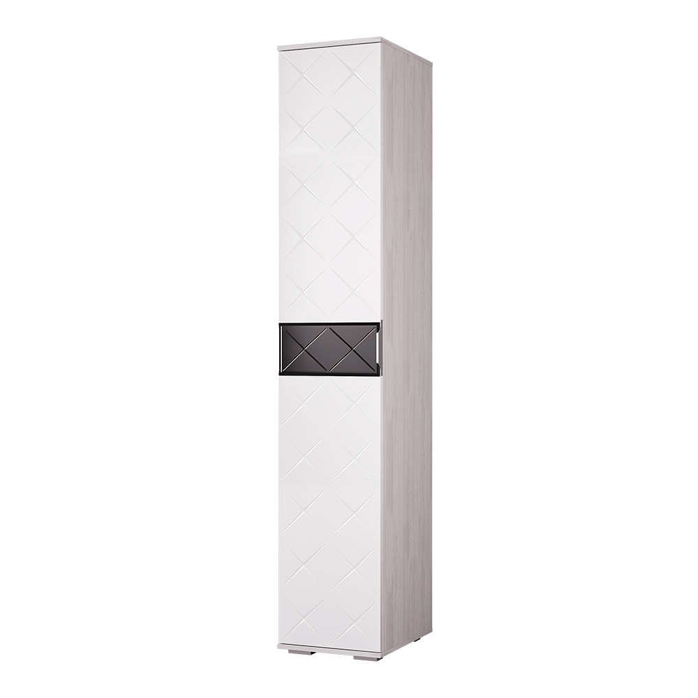 изделие имеет белый глянцевый фасад со вставкой из черного стекла (лакобель) и гравировкой в виде ромбов,