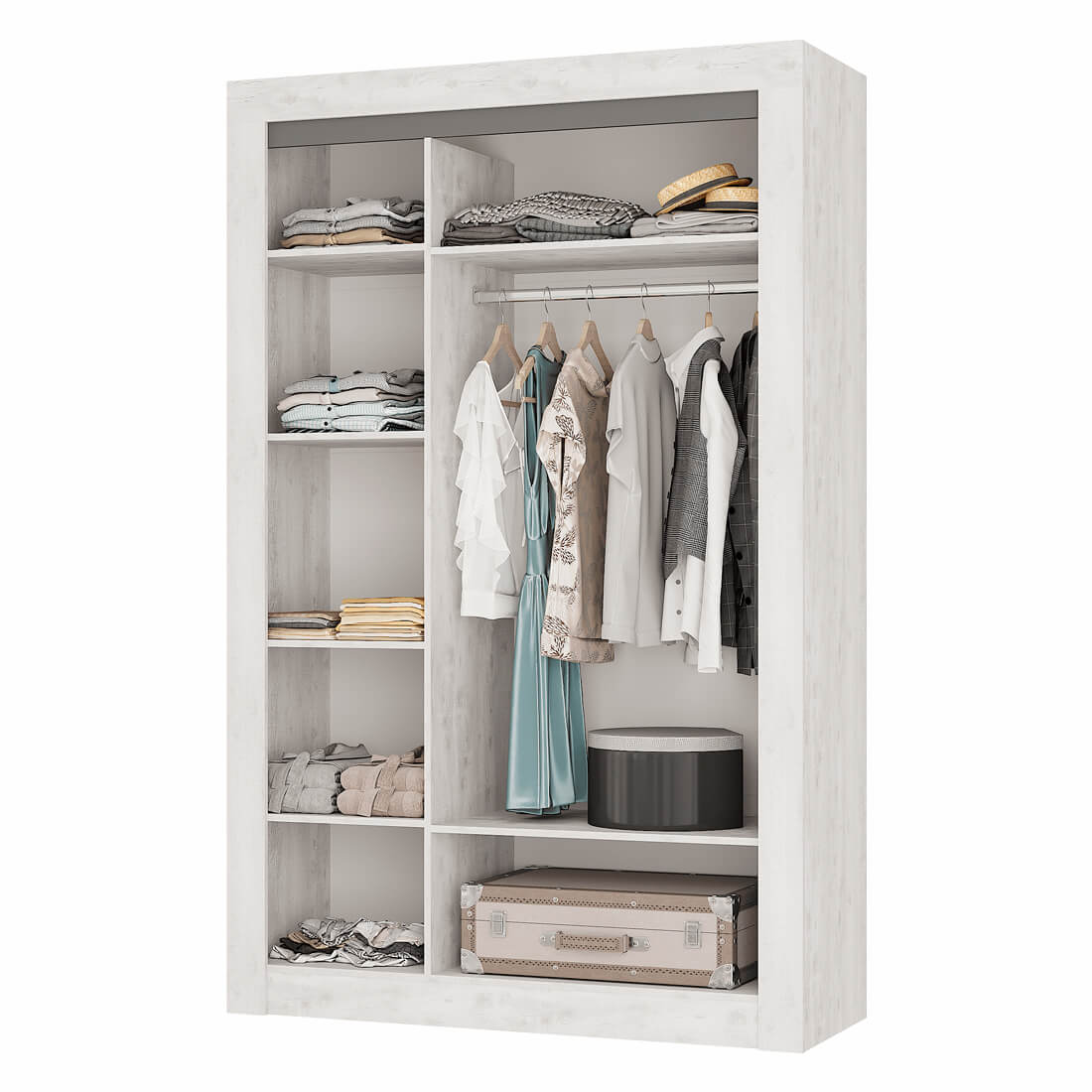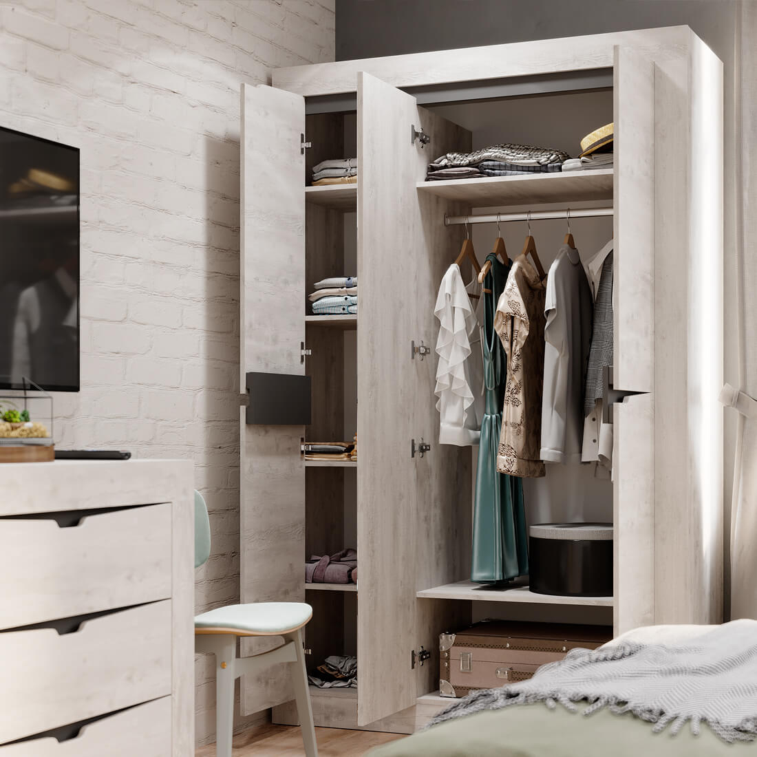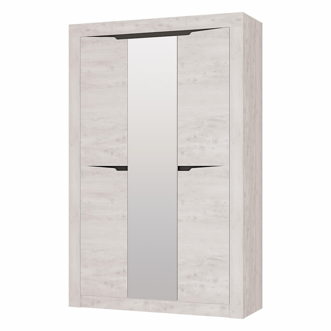 Трёхстворчатый распашной шкаф «Леонардо» с одной стороны имеет пять вместительных полок для белья, с другой стороны – удобную антресольную полку для хранения головных уборов, горизонтальную хромированную штангу для плечиков и нижнюю полку, в которой удобно хранить коробки с обувью. Особый шарм ему придаёт зеркало в полный рост, которое располагается на фасаде центральной створки. Сборка универсальная. Максимальная нагрузка на полку — 10 кг.