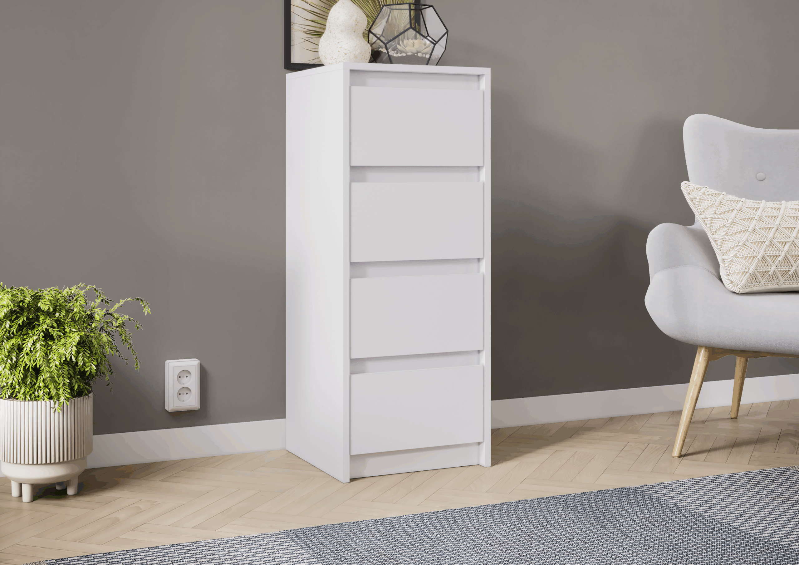 – Лицевая фурнитура отсутствует. Ящики открываются с помощью захвата рукой
