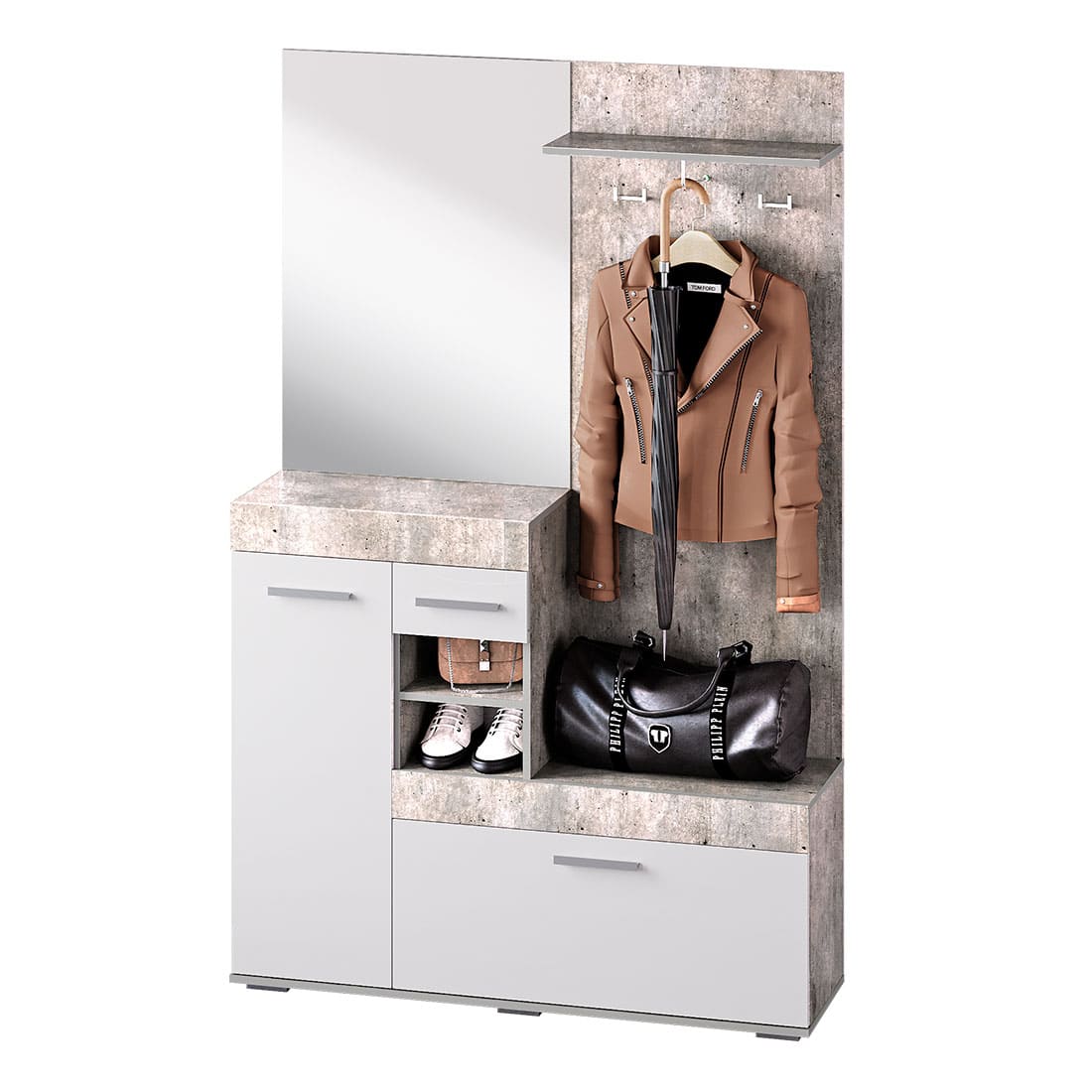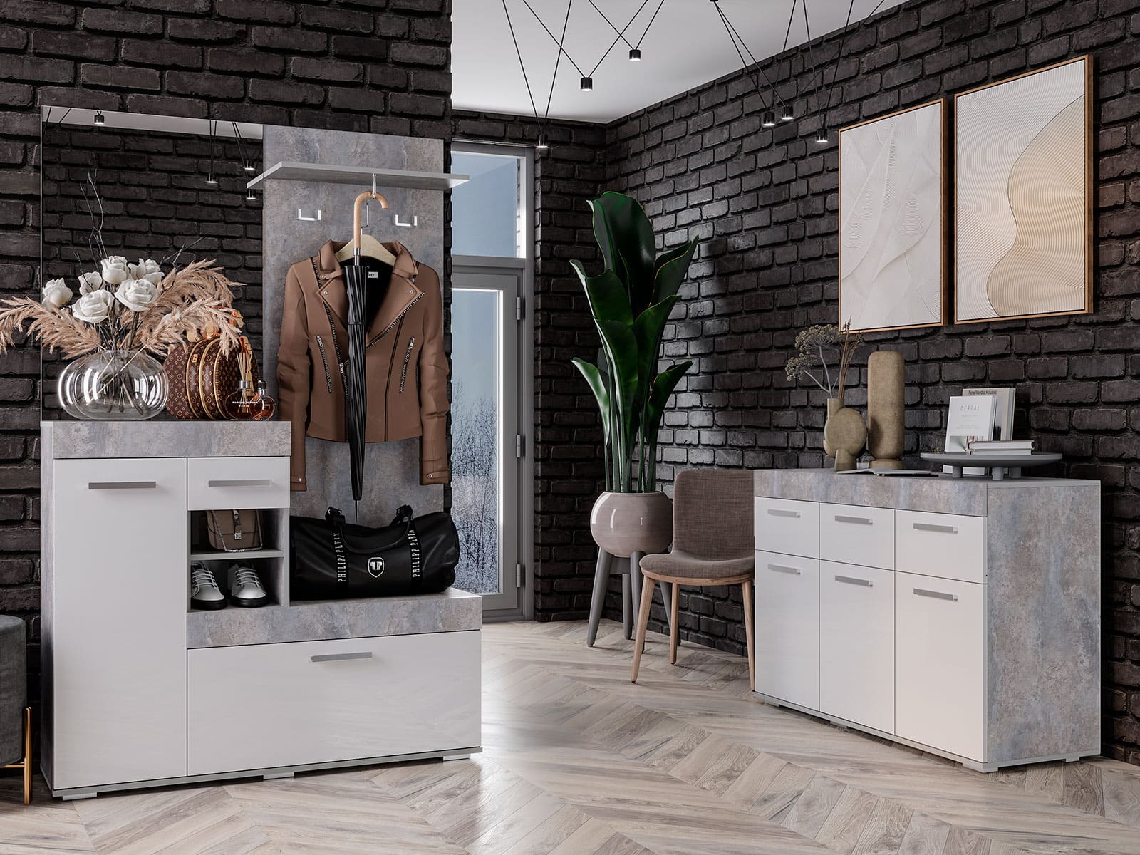 Небольшая, но стильная модель Инстайл станет прекрасным выбором для решения хранения в прихожей. Сочетание белого матового и фактуры бетона, а также наличие большого зеркала облегчают конструкцию и позволяют ей расширить пространство. Все створки, за которыми спрятаны полки для хранения вещей и обуви, оснащены эргономичными хромированными ручками. Красивое и практичное решение по лучшей цене — это прихожая Инстайл в компании «Семья Мебелони».