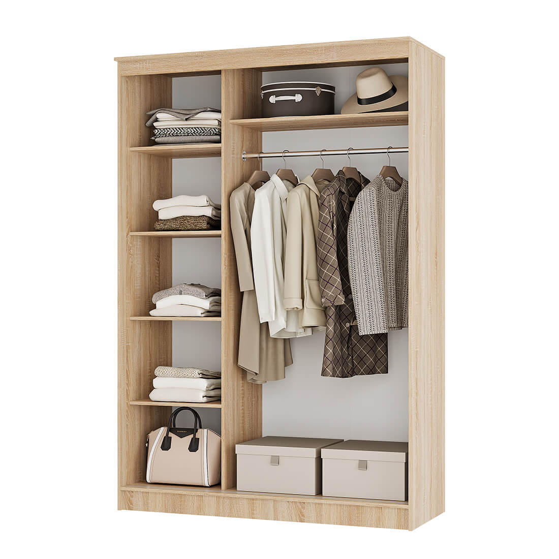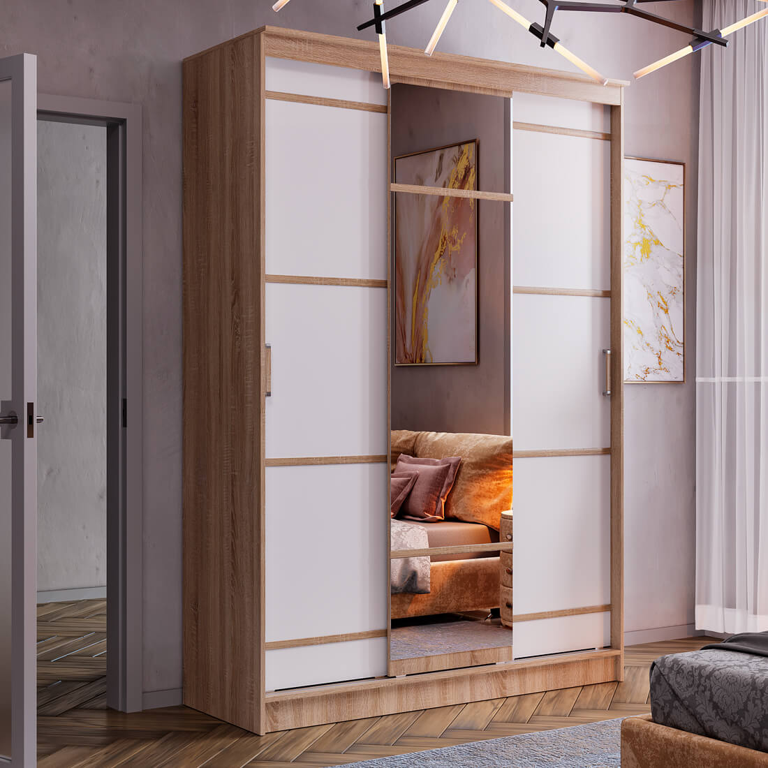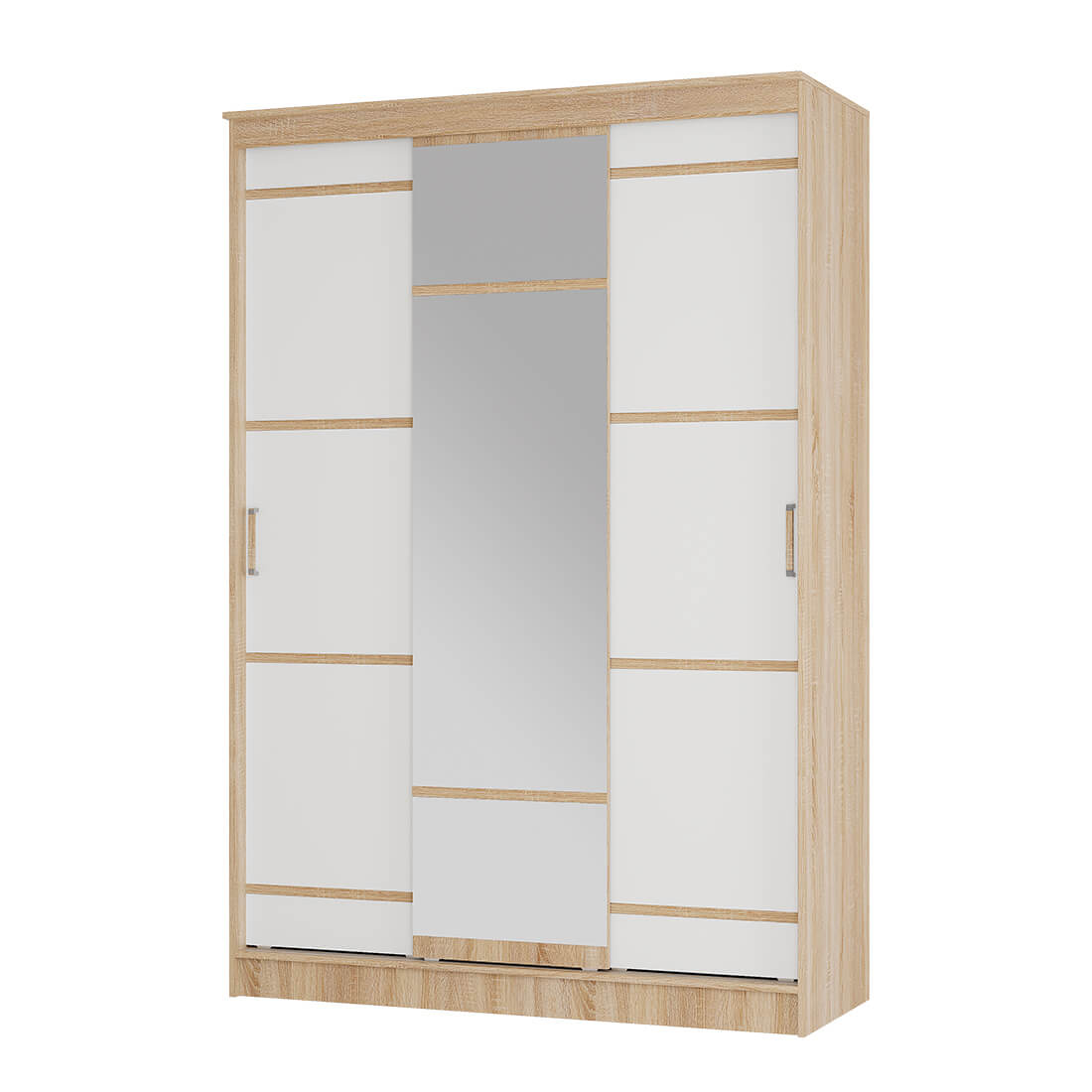 Шкаф-купе Сакура выполнен в едином стиле с остальными модулями одноимённой мебельной серии. Он сделан из ЛДСП высокого качества в комбинации цветов сонома и белый, раздвижные дверцы декорированы темными полосами и дополнены удобными ручками, центральная створка – полностью зеркальная. Внутри модель содержит все необходимые зоны для хранения одежды и обуви: большое отделение для плечиков, а также полки и ниши для остальных вещей. Правильный выбор по лучшей цене — это шкаф-купе Сакура 1,5 м в компании «Семья Мебелони».