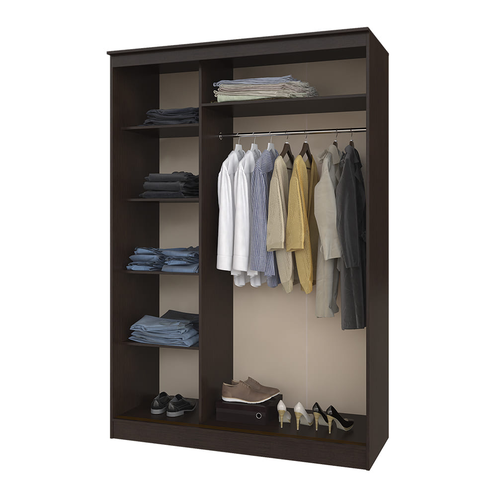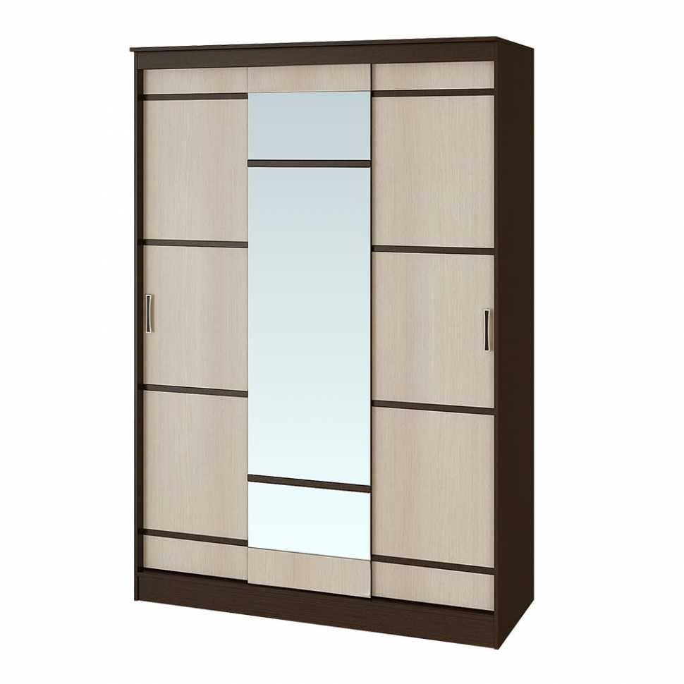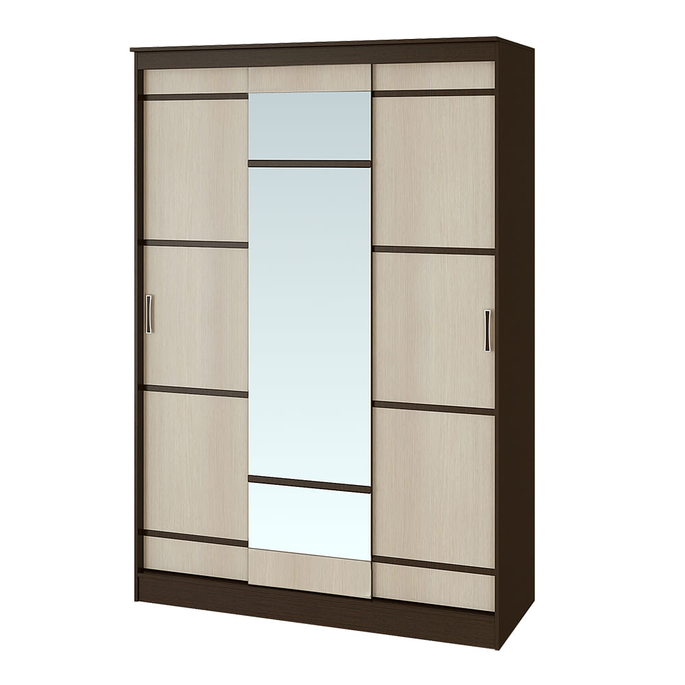 Шкаф-купе Сакура выполнен в едином стиле с остальными модулями одноимённой мебельной серии. Он сделан из ЛДСП высокого качества в комбинации цветов венге и лоредо, раздвижные дверцы декорированы темными полосами и дополнены удобными ручками, центральная створка – полностью зеркальная. Внутри модель содержит все необходимые зоны для хранения одежды и обуви: большое отделение для плечиков, а также полки и ниши для остальных вещей. Правильный выбор по лучшей цене — это шкаф-купе Сакура 1,5 м в компании «Семья Мебелони».