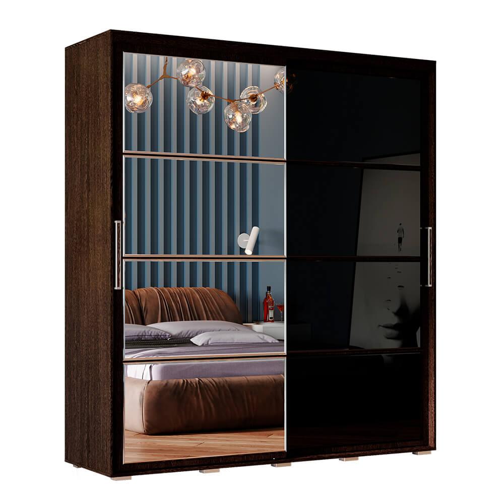 модель изготовлена из ЛДСП, одна раздвижная створка выполнена из темного стекла, а вторая – зеркальная,
